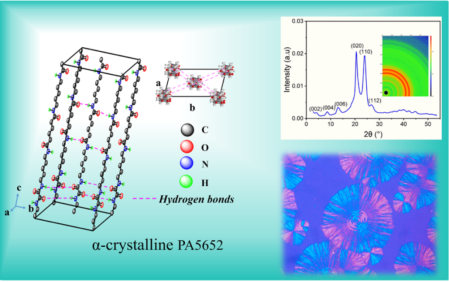 貴大新聞網(wǎng)訊(材料與冶金學院)近日,我校材料與冶金學院劉玉飛特聘教授團隊在生物基聚酰胺材料研究領域取得重要突破,相關成果以 Biobased Polyamide 5652 with α?Crystal Form: Characterization and Low Moisture Absorption為題,發(fā)表于高分子領域頂級期刊Macromolecules(自然指數(shù)期刊,中科院一區(qū)TOP)。貴州大學材料與冶金學院為論文第一完成單位,材料與冶金學院2022級碩士研究生王艷平為第一作者,劉玉飛特聘教授為通訊作者。近年來,生物基聚酰胺56(PA56)因其原料可再生、低碳環(huán)保而備受關注,但其特殊的分子結構(戊二胺單元含奇數(shù)碳原子)導致其晶體通常以γ晶型為主,飽和吸水率高達12%以上,在潮濕環(huán)境中力學性能顯著下降(如拉伸強度降低20%-30%),嚴重限制了在精密工程領域的應用,而傳統(tǒng)改性方法往往以犧牲材料其他性能為代價。針對這一難題,劉玉飛特聘教授創(chuàng)新性地提出了雙氫鍵結構調(diào)控策略:自主合成關鍵單體,設計并成功合成新型565二胺單體(C16H34N4O2),將565二胺與草酸二丁酯通過溶液聚合及